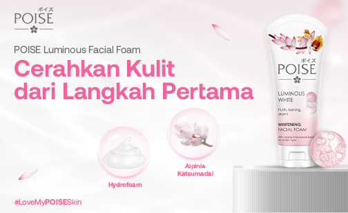 Pakai POISE Luminous White Facial Foam dengan formula Alpinia White dari ekstrak biji Alpinia Katsumadai yang bisa mencerahkan dan menutrisi kulit wajah. Diperlengkapi juga dengan teknologi hydrofoam, yang bikin busanya halus dan lembut, tapi efektif banget untuk angkat kotoran, minyak, dan sisa makeup. Nggak bikin kulit ketarik, dan bikin muka kelihatan lebih cerah dari langkah pertama. Dengan kulit yang bersih maksimal, skincare jadi gampang menyerap, dan kulit glowing bukan cuma di IG filter.