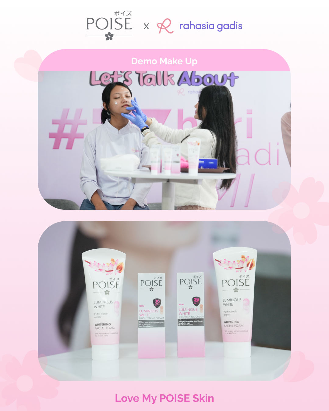 Sehabis talkshow, MC memanggil satu audience buat jadi volunteer skincare demo pakai rangkaian produk POISE Luminous White Series. Tujuan skincare demo ini biar para cewek-cewek SMA paham cara pakai produk perawatan kulit yang benar dan bisa dapetin hasil kulit luminous dalam 7 hari saja.